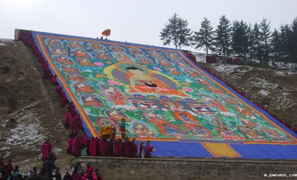 正月十三日为晒佛节,也称亮佛节,次会在午前进行,开始时,由拉卜楞寺大法台率领僧众在寺对面山麓举行晒佛仪式,由“花身土地”为前导,边跳边舞,狮虎欢跃,僧众边走过诵经,僧众抬着巨幅的彩绣大佛像—释迦牟尼佛、弥勒佛和宗喀巴大师,每幅像宽十二丈,长三十丈,用有色绸缎堆制成。当僧众将佛像在晒佛台展开后,僧众颂赞佛陀功德,念淋浴经,万众肃然,默默念诵,祈祷平安。