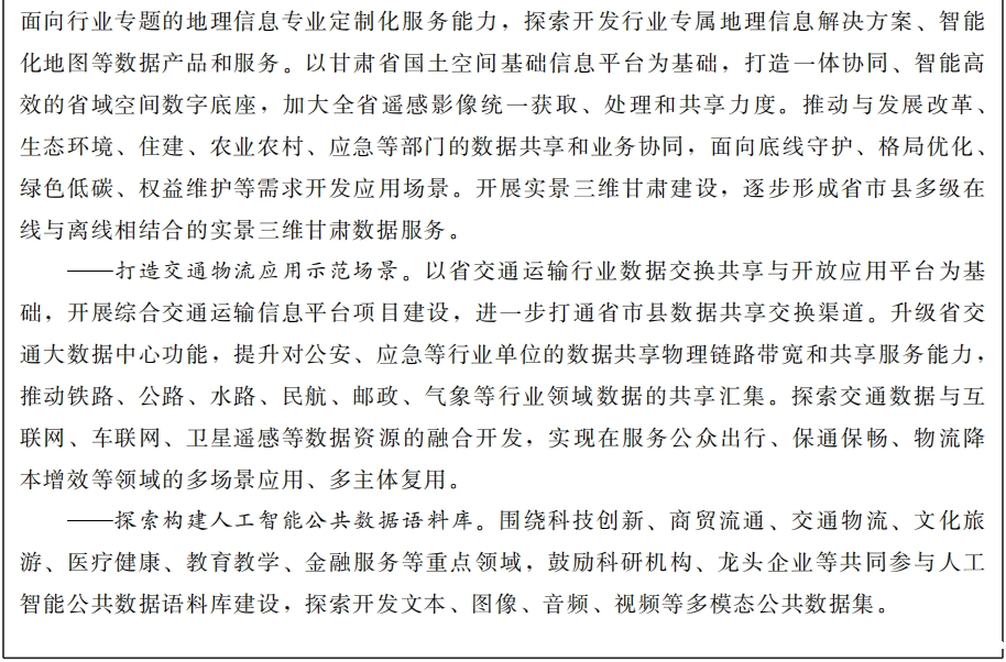六、拓展公共数据应用领域 (十三)打造“数据要素×”典型示范场景。在文化旅游、医疗健康、自然资源、交通物流、现代农业、气象服务等数字化基础较好、数据资源储备较优的领域率先打造公共数据应用典型示范场景。主动推进公共数据应用场景供需对接、部省协同,争取纳入国家数据局重点联系示范场景。 (十四)深化“人工智能+”融合应用。加强数据、算力、算法等资源向人工智能领域倾斜,推动基础科学数据集、高质量语料库汇聚,提供算力资源供给和云边端协同计算技术能力支撑,支持人工智能大模型开发、训练和应用。鼓励行业领军企业、新型研发机构等积极开展联合创新,促进行业模型跨域研发。加快布局人工智能及大语言模型技术在自然资源、交通物流、医疗健康、警务执法、农业生产、城市全域数字化转型等领域应用。